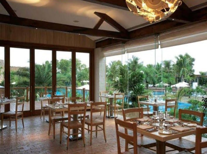Pool side terrace restaurant with 100 pax capacity surrounded by lush greenery and sea views.